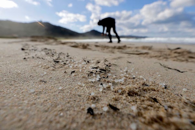 Óscar Corral. Una voluntaria recoge 'pellets' en la playa de Noia. 01.2024.